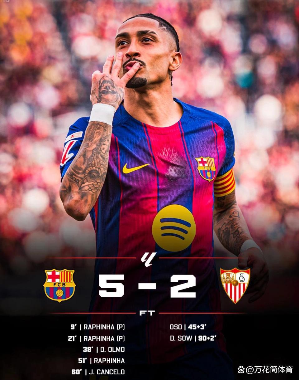 只是9分钟之后,坎塞洛再次成为焦点。他从左路带球锐不可挡,在禁区前集结变向晃开角度,随后从容推射远角再下一城,巴萨将比分扩大到5-1,比赛基本失去悬念。第92分钟,塞维利亚的奥索左路送出精确传中,索乌抢点头球破门,将比分改写为2-5。最终巴萨5-2完成了一场绝对的复仇,同期也喜提球队西甲4连胜,在争冠最要道阶段,他们依旧向上皇马4分,压力再次扔回给了星河战船。